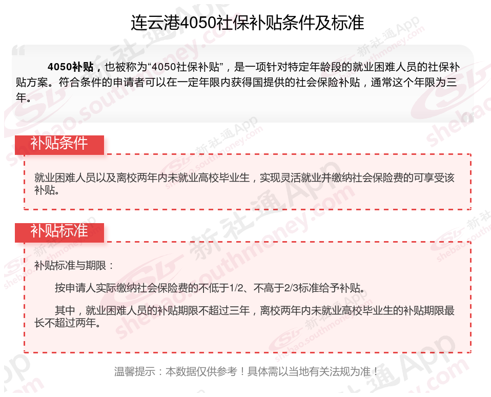 一、2023-2024年连云港4050社保补贴标准,最新领取条件来了