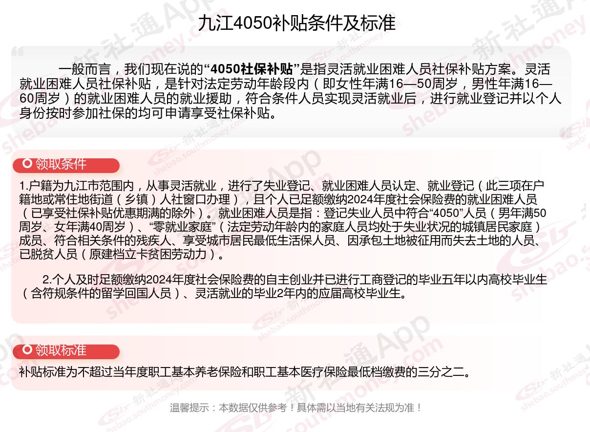 一、九江4050社保补贴标准及条件2023-2024年