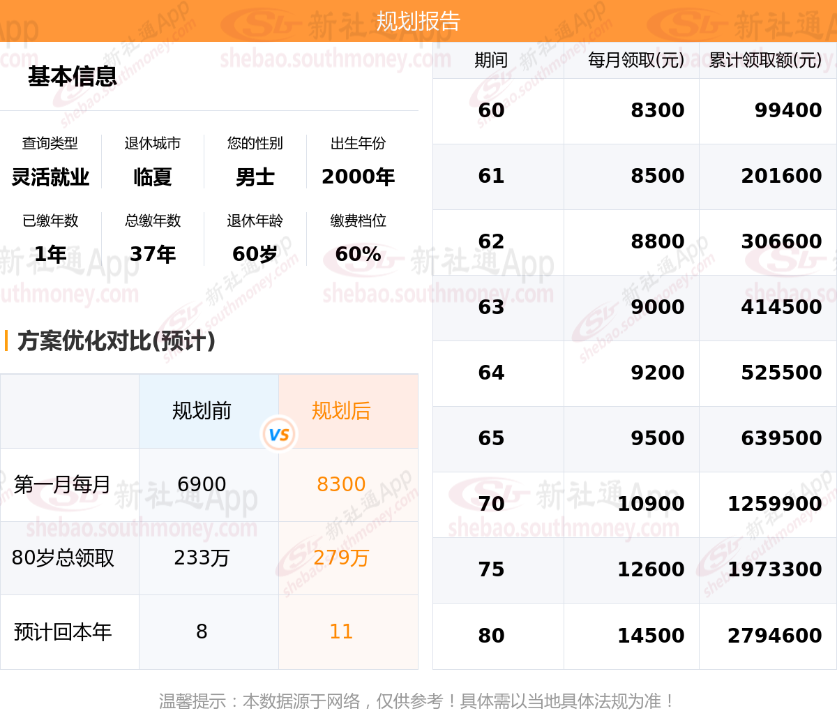 规划前:60岁第一个月约领6900元,规划后:60岁第一个月约领8300元