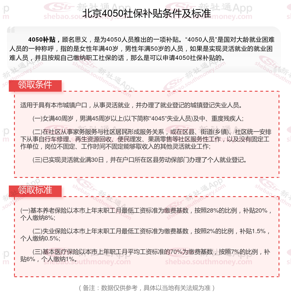 一、北京4050社保补贴标准及条件2023-2024年