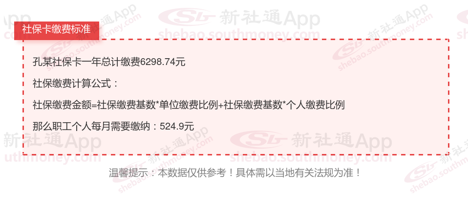 由上图得知,孔某社保卡一年需要缴纳6298.74元,职工个人月缴纳524.9元。