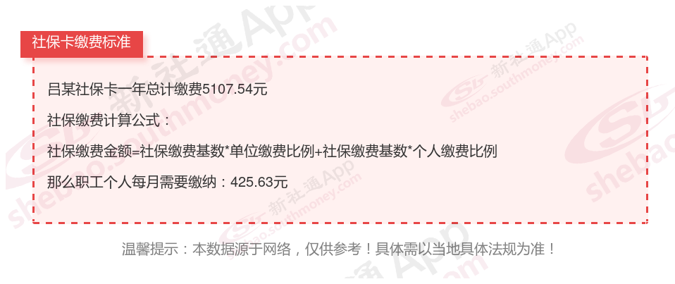 由上图得知,吕某社保卡一年需要缴纳5107.54元,职工个人月缴纳425.63元。