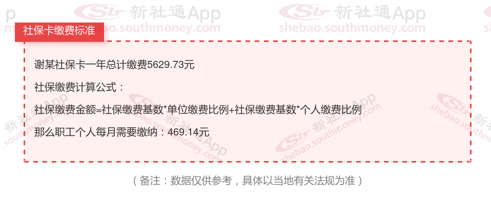 由上图得知,谢某社保卡一年需要缴纳5629.73元,个人部分每月需要缴纳469.14元。