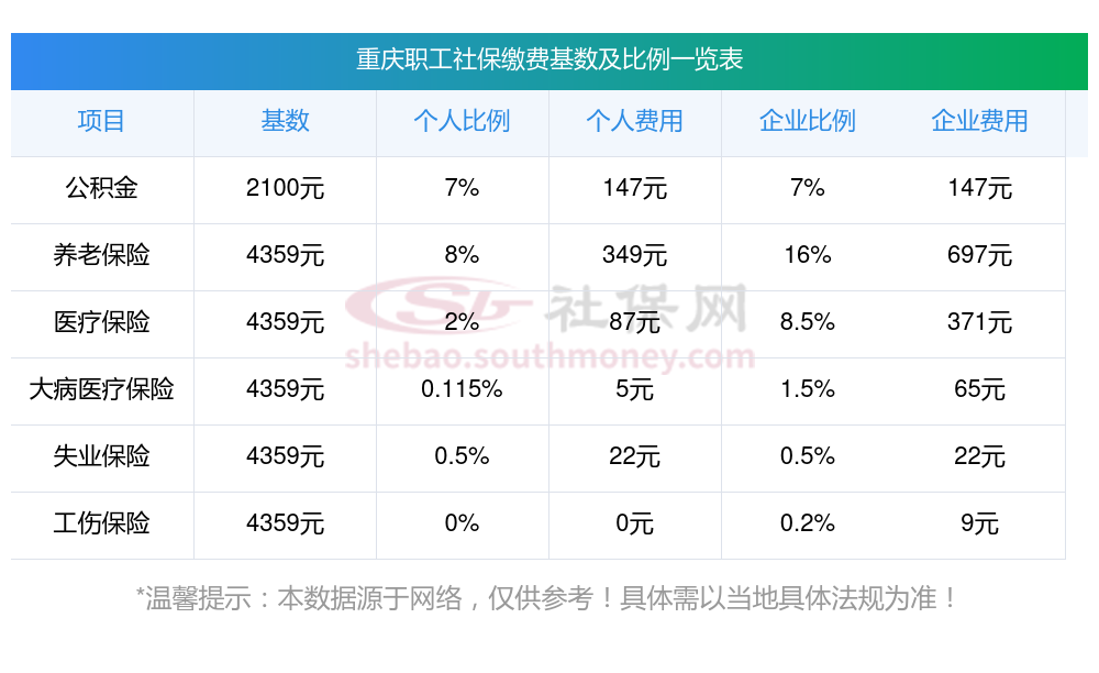 重庆缴费社保比例一览 社保公司和个人各交多少?下表是2024-2025年重庆社保费用明细参考,社保缴费查询工具提供的最新数据如下: