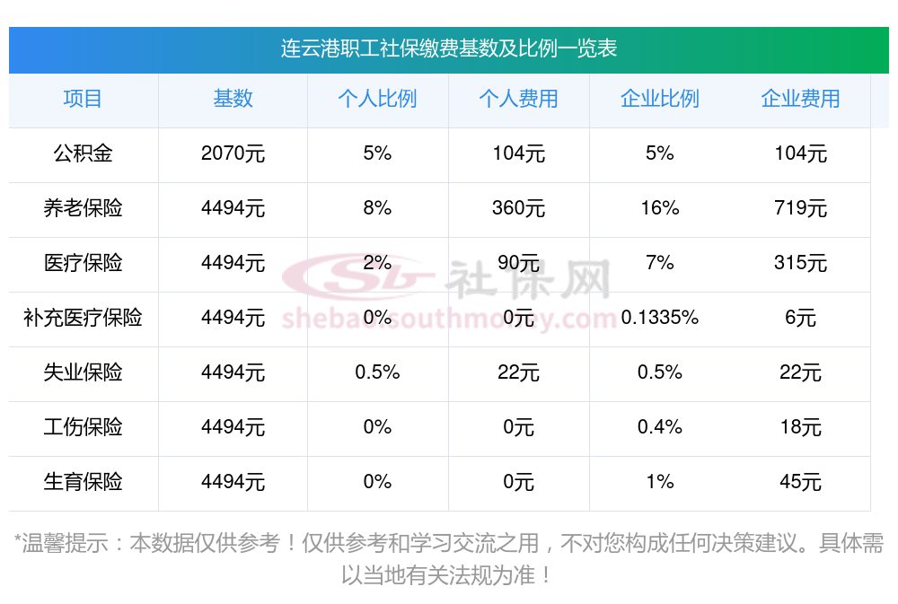 连云港缴费社保比例一览 社保公司和个人各交多少?下表是2024-2025年连云港社保费用明细参考,社保缴费查询工具提供的最新数据如下: