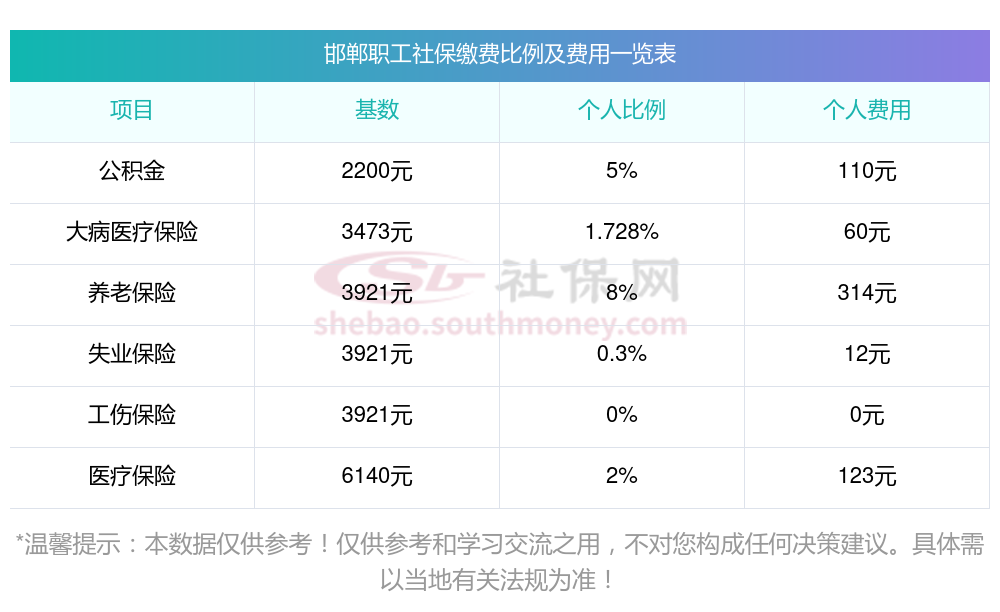 据了解,邯郸社保缴费基数标准2025年,(社保最低一个月要交多少钱)邯郸社保费用如下: