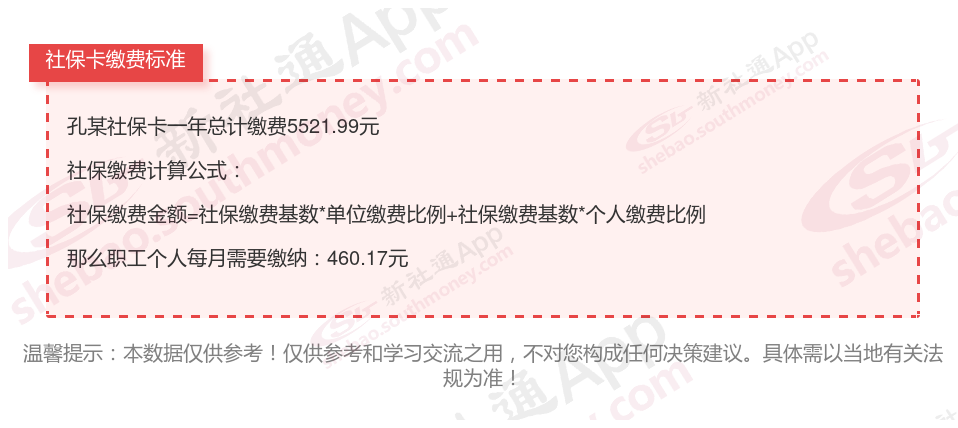 由上图得知,孔某社保卡一年需要缴纳5521.99元,职工个人月缴纳460.17元。