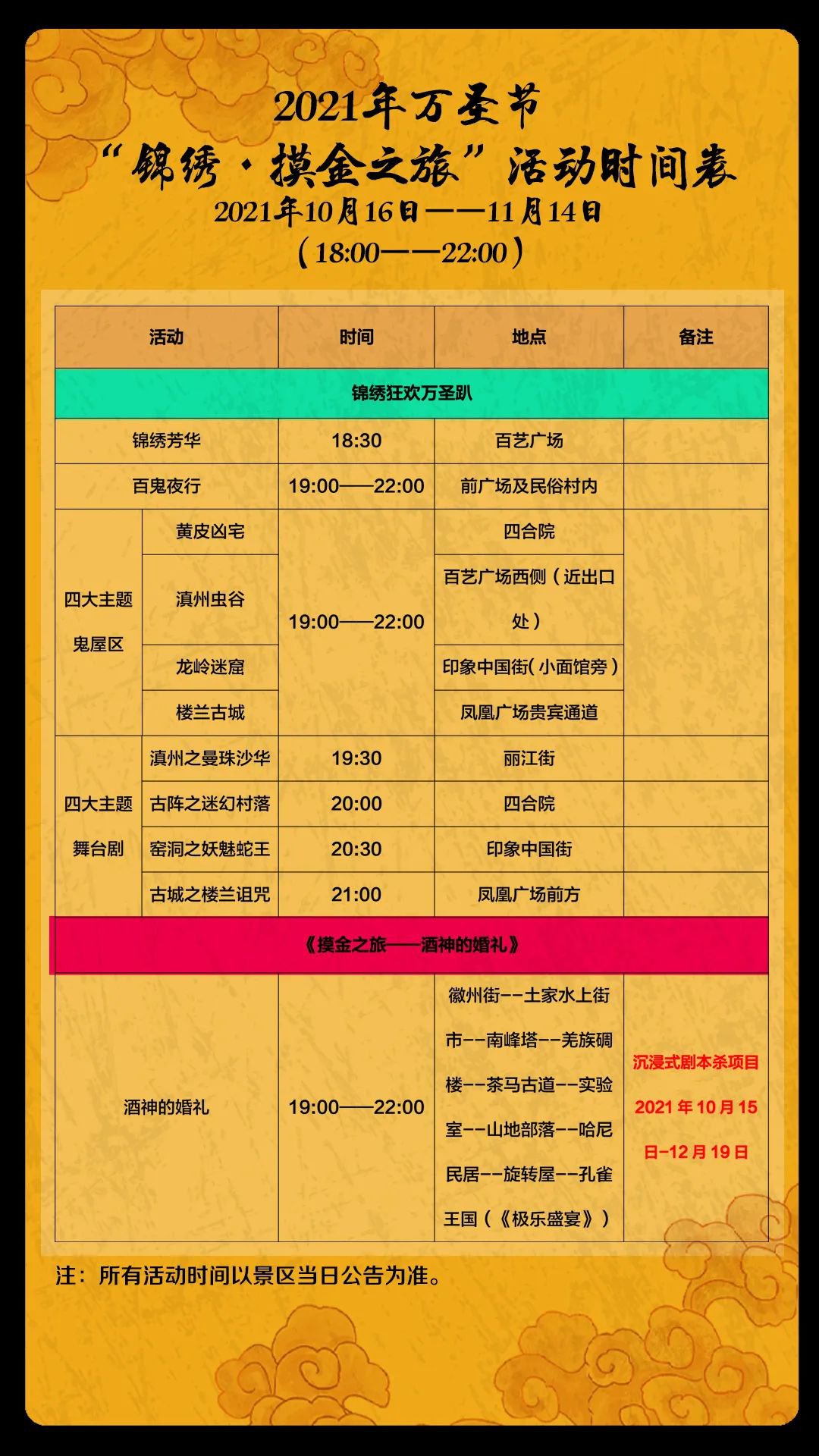 10月16日,锦绣中华万圣摸金之旅来了!全国最大户外实景沉浸式剧本杀《酒神的婚礼》,50000㎡实景体验,百名高颜值NPC,万圣狂欢party!更多惊吓尽在4大主题鬼屋探秘,逼真惊悚场景还原,300+妖魔鬼怪齐聚!全新推出4场万圣主题秀,新颖的故事线,神秘的盗墓之旅!沉浸式万圣狂欢现场,彻夜“音魂不散”。